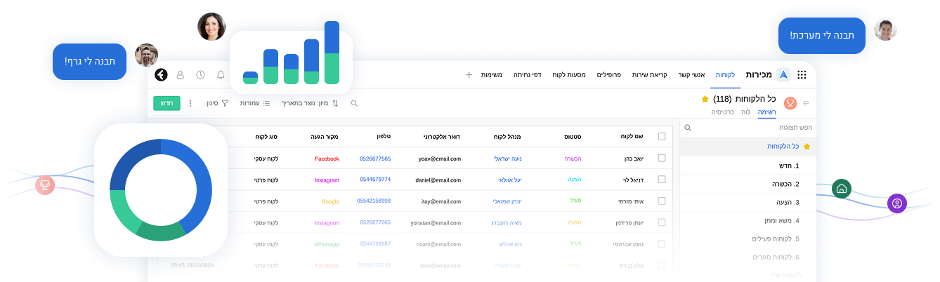 צרו והטמיעו בקלות דפי נחיתה וטפסים מותאמים אישית בכל מקום – באתר, במיילים או בקמפיינים. הכול מחובר ישירות למערכת, כך שכל ליד נכנס אוטומטית ל-CRM שלכם, מה שמאפשר לכם לנהל שיווק חכם, מדויק ואפקטיבי יותר.